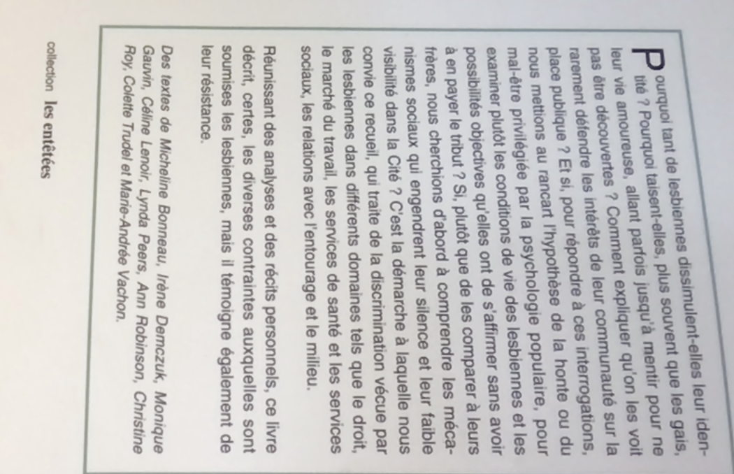 De nombreuses lesbiennes considèrent qu’elles sont loin de bénéficier d’une égalité juridique formelle, encore moins d’une égalité réelle. Regroupant des recherches et des témoignages, ce livre rend compte de la discrimination vécue par ces femmes à partir de données originales, constituées pour une large part d’études de cas, d’entrevues et de récits personnels. Il s’agit ici d’un premier livre en langue française qui aborde la problématique de la discrimination, et l’un de ses mérites est sans doute de donner la parole aux premières concernées.